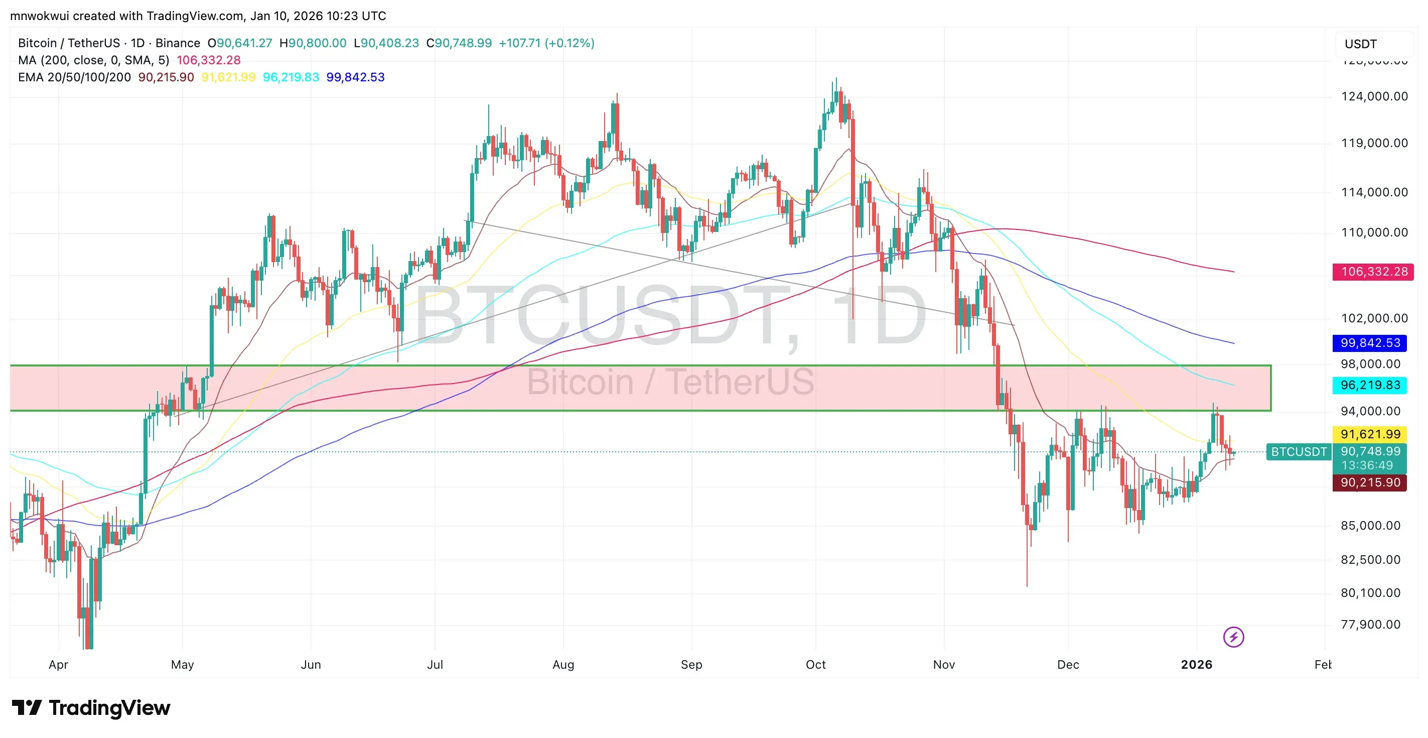 Bitcoin’s price action since the start of January reflects a market attempting to regain balance after November and December’s sharp sell-off. BTC climbed above its 20-day EMA near $90,200, briefly lifting confidence that a short-term trend reversal could be forming. Price is currently consolidating around the $90,000–$92,000 region, just beneath a previously broken demand zone that now acts as resistance.