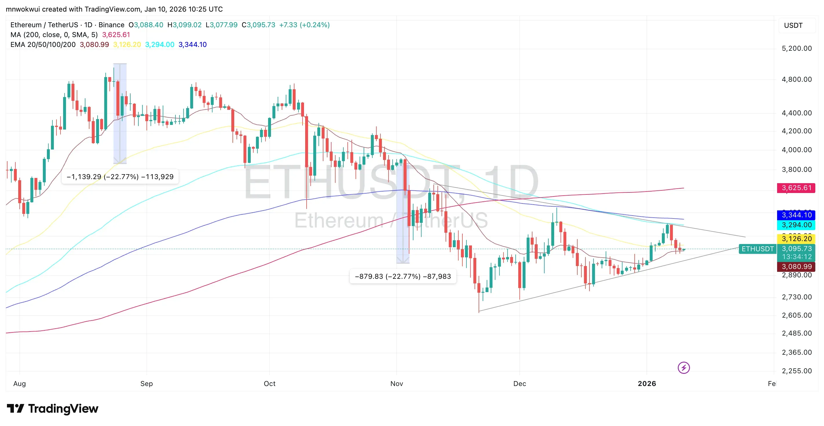 Ethereum has started the year in a more technically constrained position than Bitcoin. ETH is trading near $3,100, wedged between rising short-term support and descending resistance from late 2025. This tightening structure reflects uncertainty, with both buyers and sellers showing hesitation.