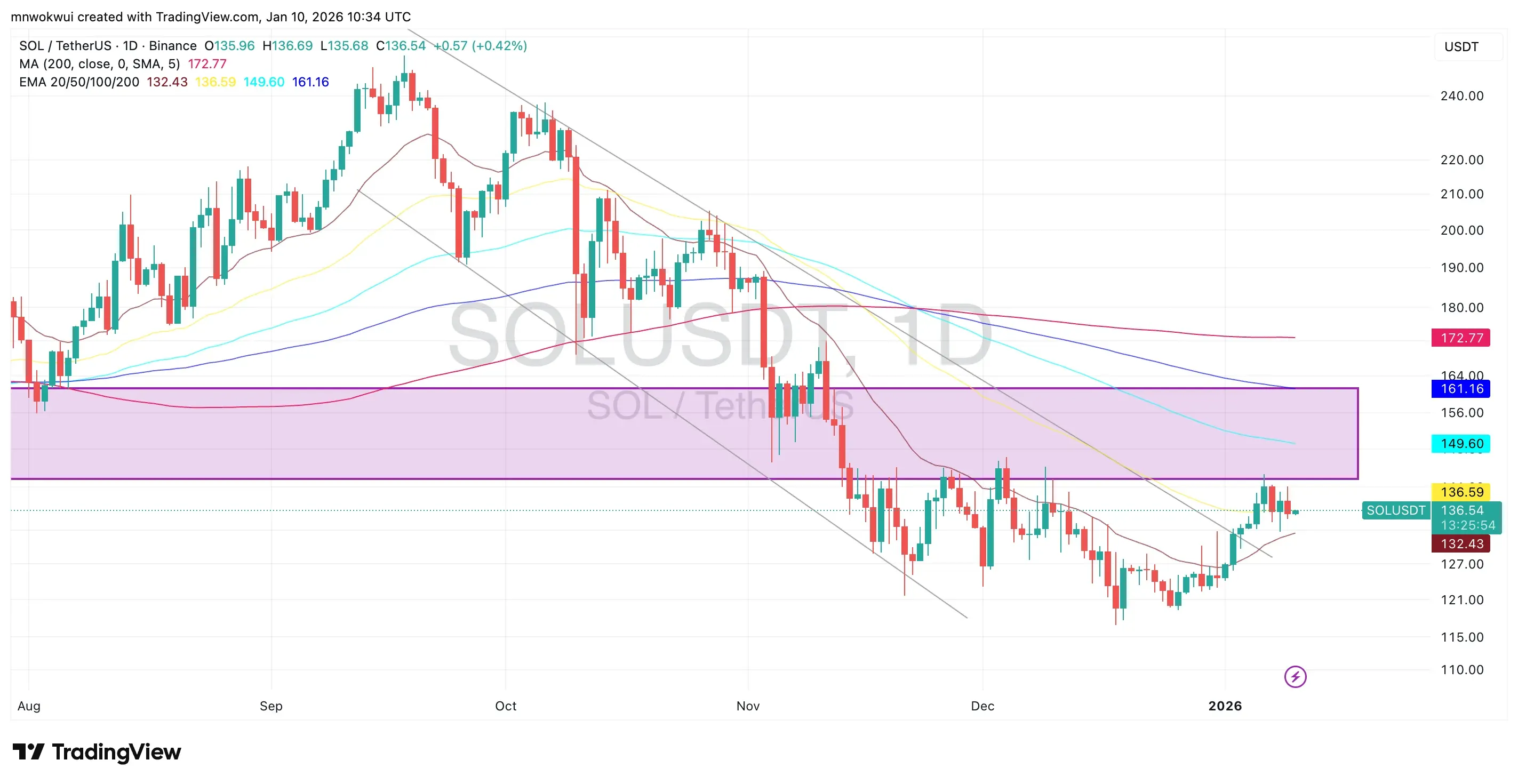 Solana has shown tentative signs of recovery after finding a base in the $120–$130 region late last year. Since the start of January, SOL has climbed toward $136, reclaiming its 20-day EMA and forming higher lows on the daily chart.