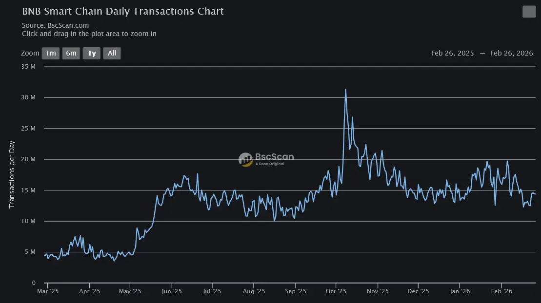 The raw metrics tell a compelling story. BNB Chain is averaging 2.5 to 3 million daily active addresses on its smart chain alone in early 2026, with single-day peaks pushing above 3 million during high-activity periods. Including opBNB, the combined figure reaches 4 to 5 million. That puts BNB Chain comfortably ahead of Ethereum's roughly 1.8 million, though Solana still leads on raw active address counts.