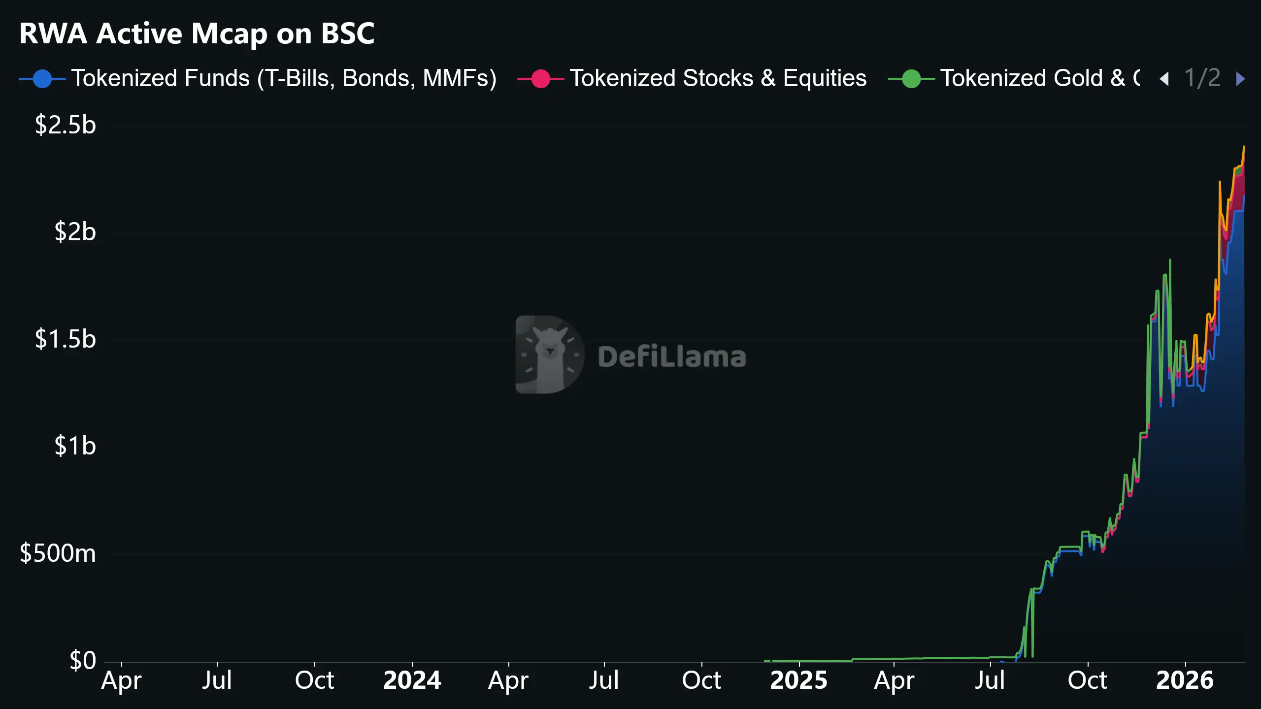RWA has been BNB Chain's breakout category. Total onchain RWA market cap currently sits at $2.56 billion per DefiLlama, up from $2 billion at the end of Q4 2025 and a staggering 555% year-over-year. That makes BNB Chain the second-largest RWA network behind Ethereum, with 48 asset issuers across 22 asset classes now active on the chain.