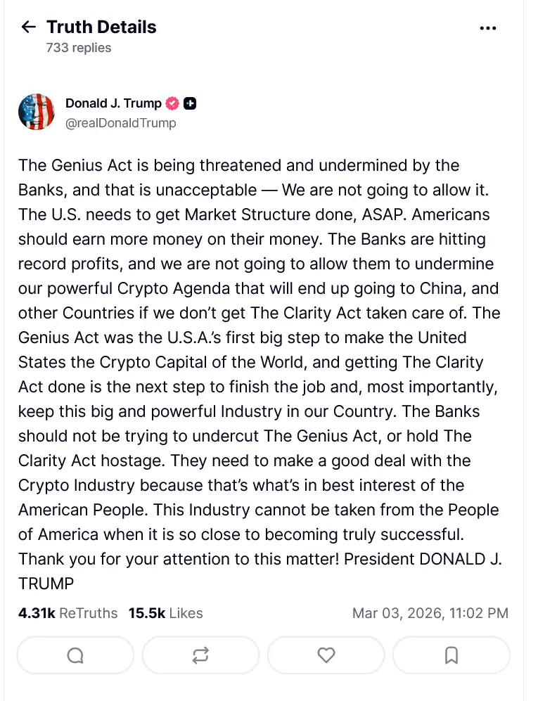 The Truth Social message, which drew 4,310 ReTruths and 15,500 likes within hours, was a direct attack on U.S. banks. Trump said the GENIUS Act is being "threatened and undermined by the Banks" and called it "unacceptable." He warned that crypto business risks going "to China, and other Countries" if the CLARITY Act doesn't get done. He also demanded banks "make a good deal with the Crypto Industry."