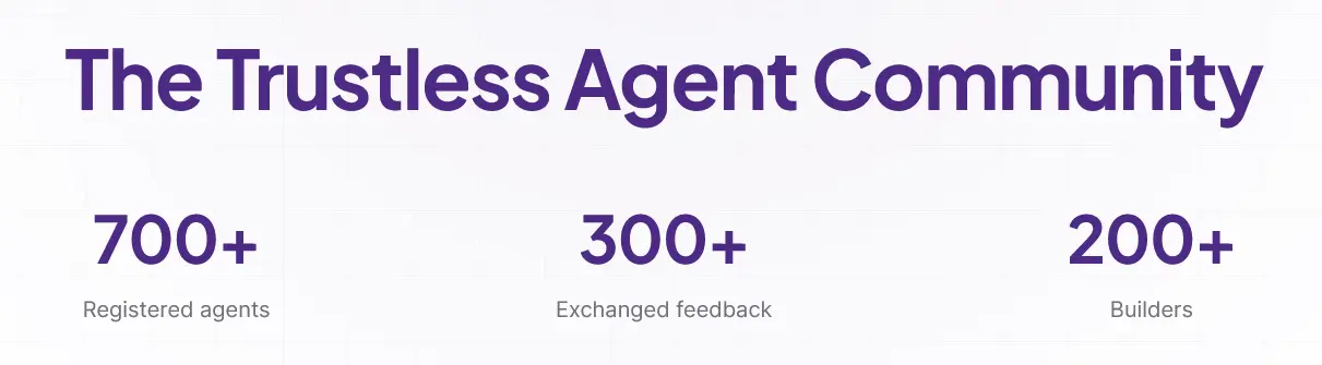 During the testnet, over 10,000 agents registered before the mainnet deployment. The live network currently shows more than 700 registered agents and 300 exchanged feedback signals, with over 200 builders actively contributing.