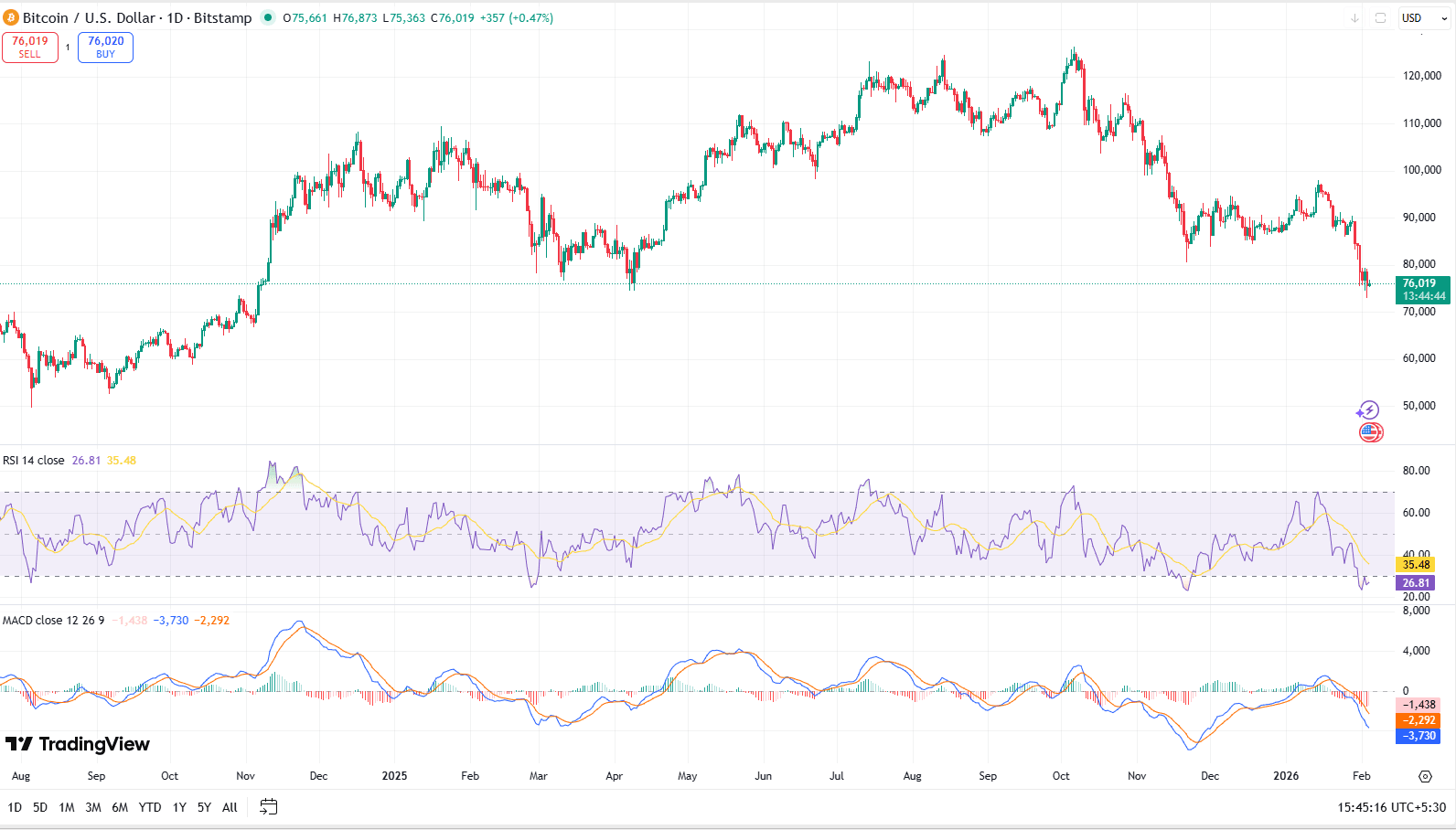Bitcoin can still fall further from current levels near $76,000. Based on the daily chart, momentum indicators, and recent expert analysis, the most realistic downside range sits between $74,000 and $70,000, with deeper levels only coming into play if selling pressure accelerates.