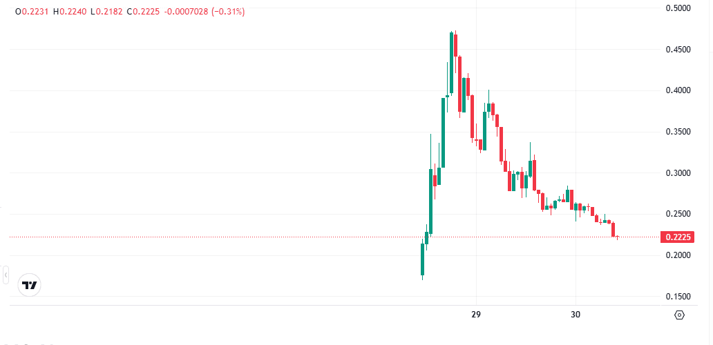 The chart displays high volatility during the initial spike, with wide candlestick ranges indicating significant intraday price swings. As the token declined, candlestick ranges narrowed slightly, suggesting decreasing volatility as the market finds equilibrium. The current consolidation around $0.22 could represent either a temporary support level before further decline or a base for potential recovery.