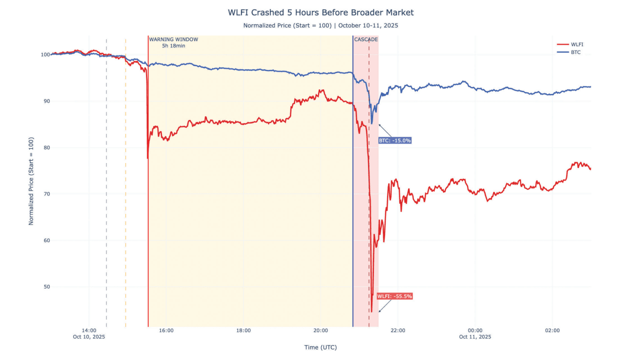 WLFI began falling at 3:32 PM UTC on October 10, 2025. The broader market cascade started at 8:50 PM UTC, creating a five-hour and eighteen-minute warning window. During this period, WLFI dropped 45% while Bitcoin declined only 6%, creating a clear divergence signal that most traders missed.