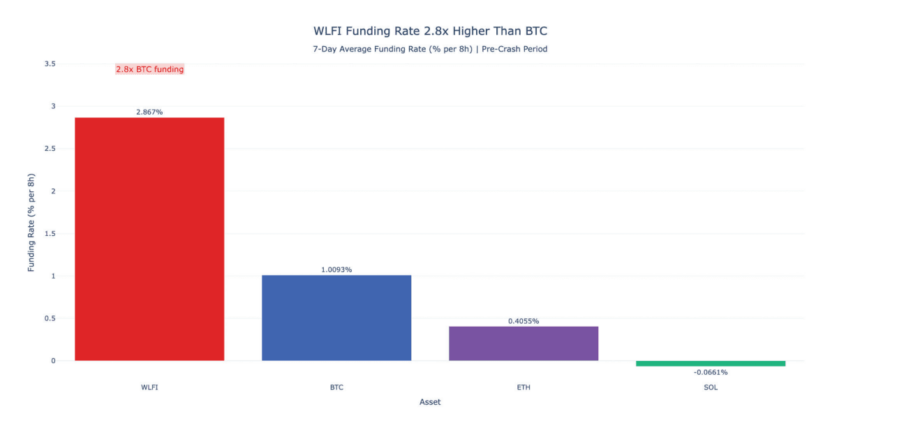 WLFI's funding rate reached 2.87% per eight hours on October 10, compared to Bitcoin's 1.01%. This represents a 2.8x differential. In perpetual futures markets, funding rates measure the cost that long position holders pay to short sellers. WLFI's rate translated to approximately 131% annualized borrowing costs.