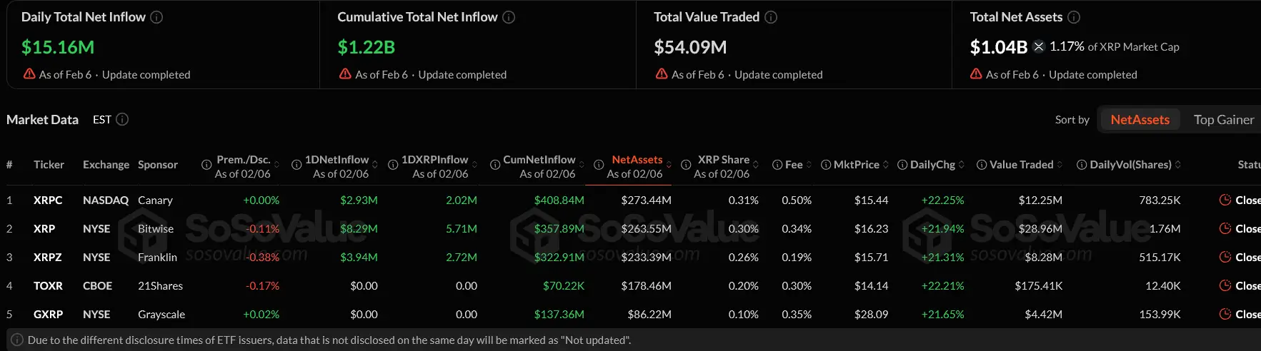 As of February 6, 2026, XRP ETF total net assets sat at $1.04 billion, roughly 1.17% of XRP's total market cap. Daily trading volume hit $54.09 million on that date, with a net inflow of $15.16 million. For context, DOGE ETFs hold less than $9 million in total assets. The gap between XRP and most altcoin ETF products is significant.