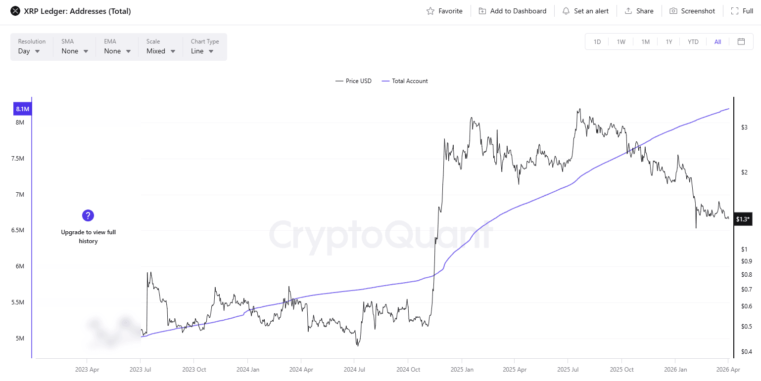 As of April 2, 2026, the XRP Ledger had 8,189,798 total addresses, up from 7,921,350 at the start of the year, according to CryptoQuant on-chain data. That represents a 3.39% increase in Q1 2026 and a new all-time high for the network.