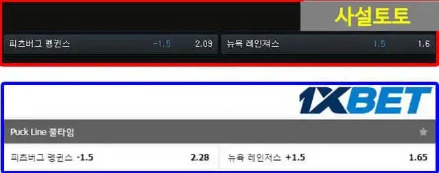 위 이미지는 해외토토사이트 원엑스벳과 여기저기 광고 배너 몇십 개 띄워 놓고 자금력 두둑하다고 광고하는 이름 좀 있는 어느 사설 업체와의 배당 비교입니다.