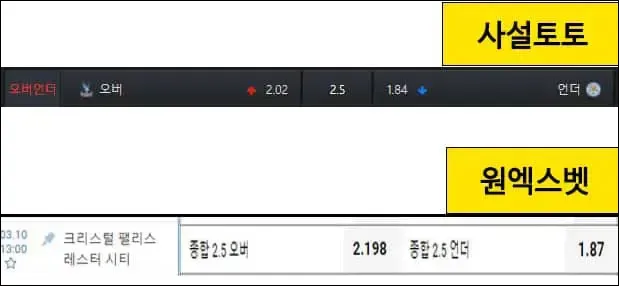 제가 굳이 더 차이나는 것만 골라 둘을 편파 비교를 하는 게 아니라, 정말 원엑스벳과 사설토토를 비교해 본다면 배당 차이는 모두 다 이렇습니다.
