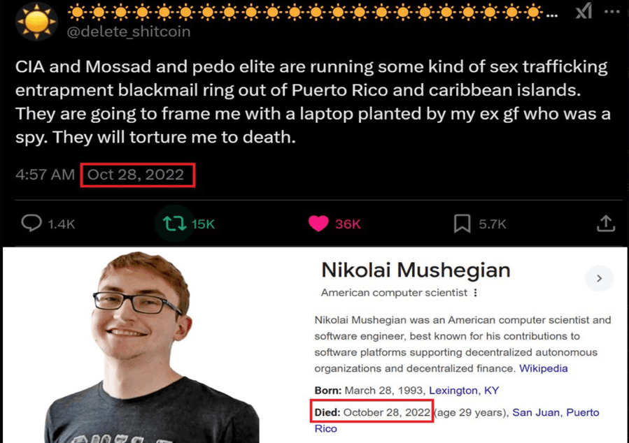 The same subgroup frequently references the death of Nikolai Mushegian, an early contributor to MakerDAO. Mushegian died in 2022 after drowning in Puerto Rico, a death ruled accidental by authorities. Some within these communities speculate that his opposition to adding freeze or control mechanisms to stablecoins made him a target. No evidence supports this claim, and no investigation has substantiated it.