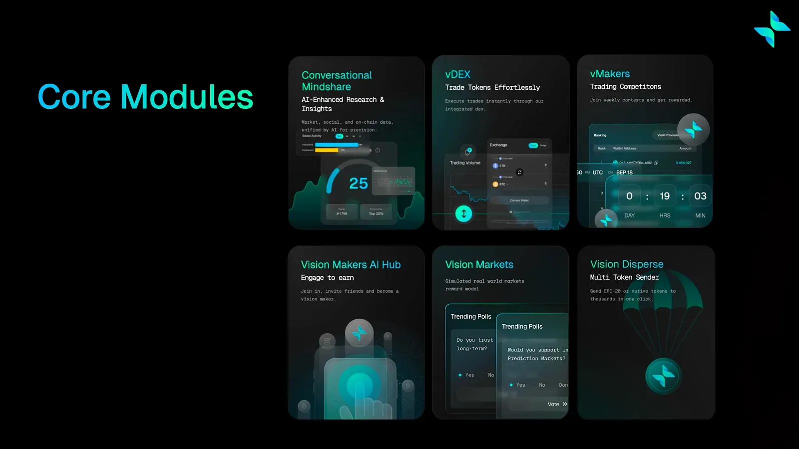 Execution is embedded directly within the platform. The integrated DEX engine aggregates liquidity sources to secure optimal pricing and enables frictionless token swaps without external routing. Vision Markets introduces outcome-based participation with reward alignment for accurate predictions. vMakers adds competitive trading through performance leaderboards and shared reward structures. Vision Disperse automates token distribution across multiple wallets with scalable templates for teams and communities.